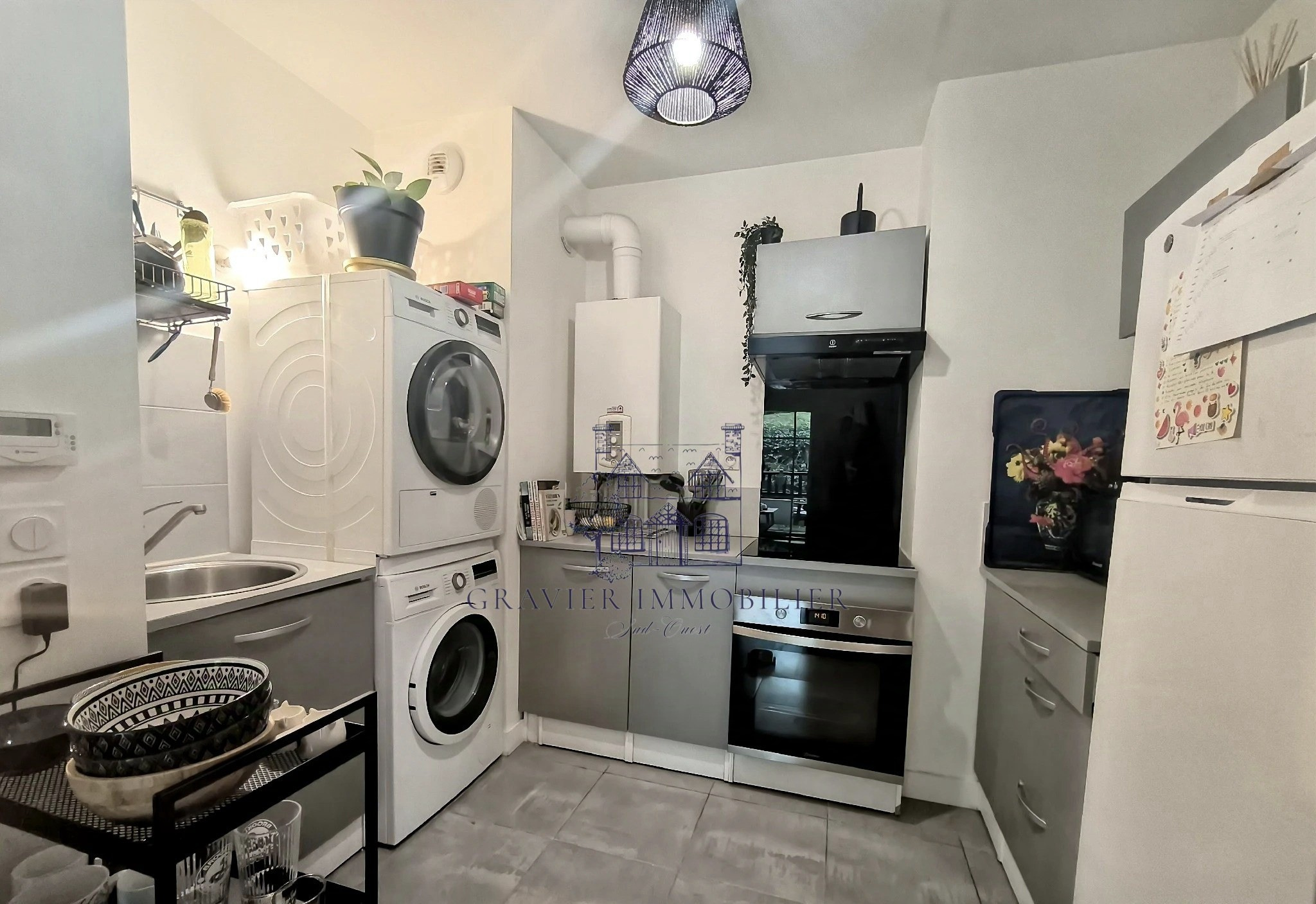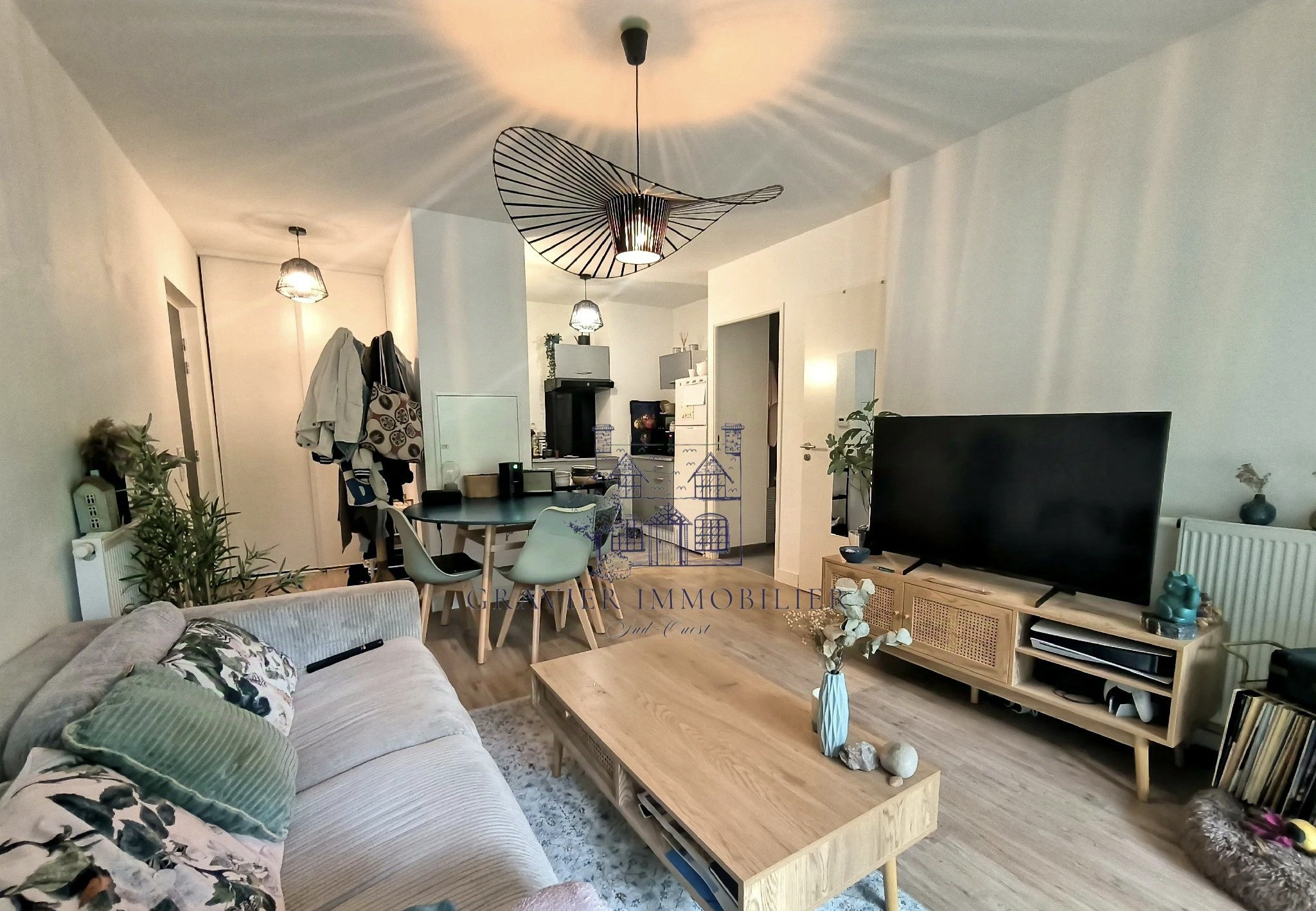 Vous y trouverez un séjour de 22 m² avec cuisine ouverte, une chambre confortable, une salle d'eau avec WC, une buanderie et une terrasse de 9 m² sans vis-à-vis, offrant une vue verdoyante sur les arbres.