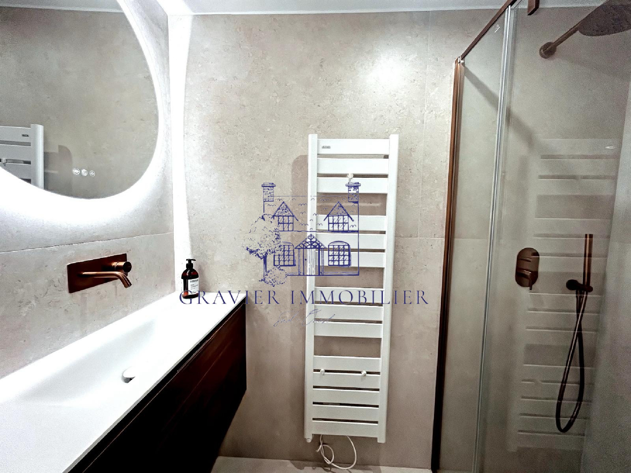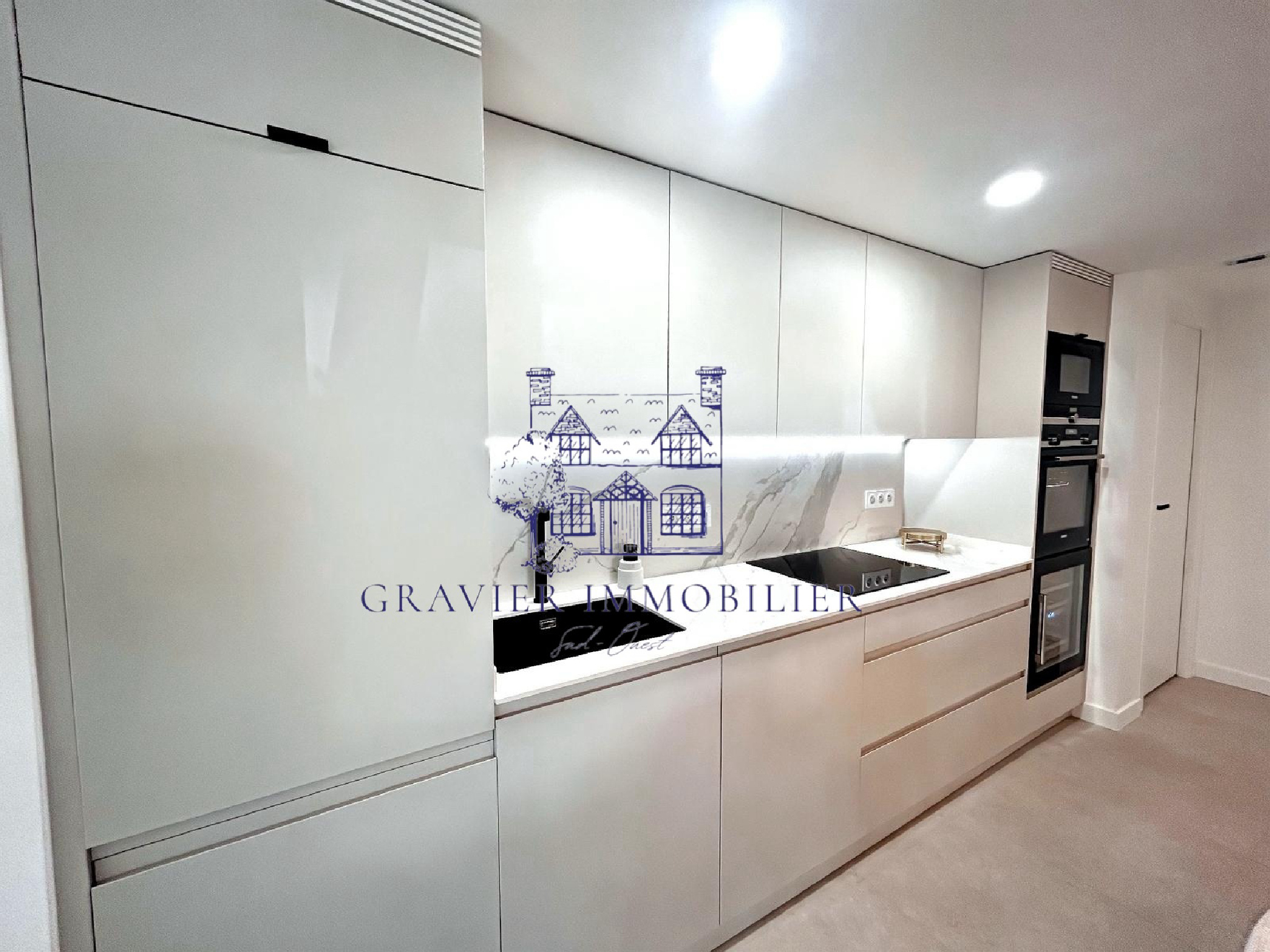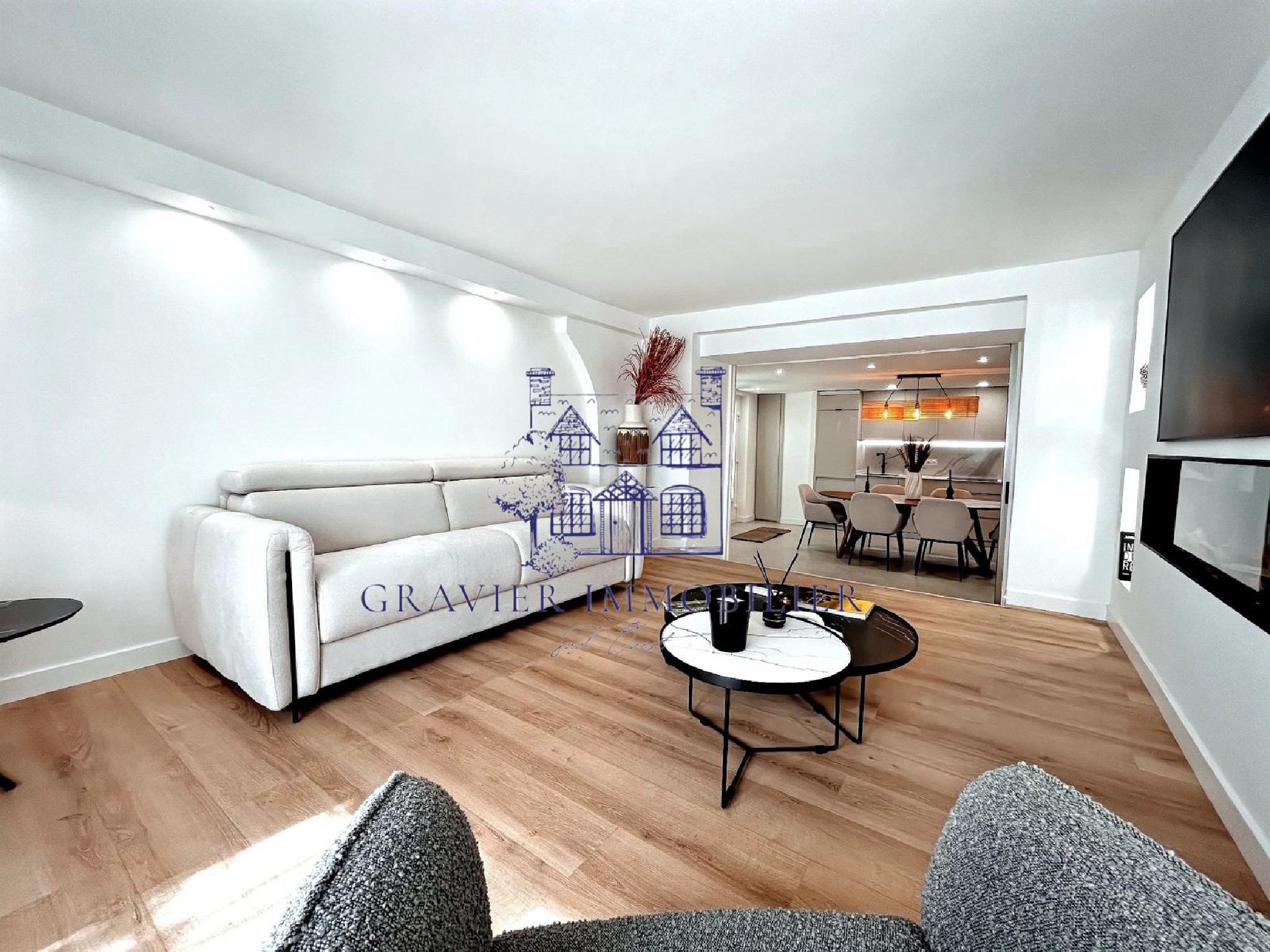 L’appartement a été pensé comme une suite hôtelière de charme, où chaque détail compte. Dès l’entrée, La cuisine est un bijou de modernité : cave à vin, four, micro-ondes, lave-vaisselle, réfrigérateur intégré, rangements astucieux et table conviviale, elle donne sur le salon, baigné de lumière, avec une ambiance chaleureuse, sublimée par une cheminée électrique performante capable de chauffer jusqu’à 40 m². Le salon peut se transformer en chambre d’amis avec un confort absolu. Une porte à galandage opaque permet d’offrir à vos invités leur propre intimité, comme dans une vraie suite indépendante.