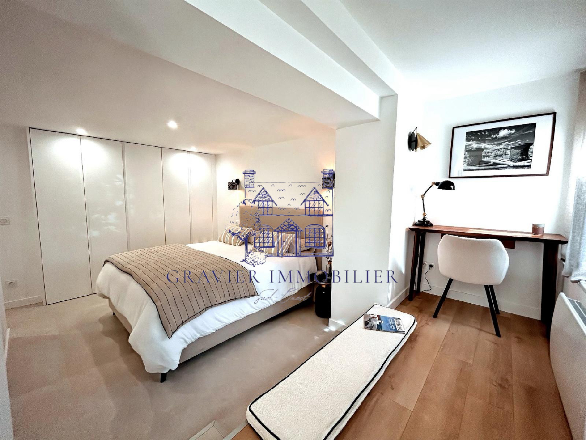 Puis, on découvre une véritable suite parentale, où vous pourrez installer un lit 160x200, un grand placard sur mesure, un espace bureau inspirant et une salle d’eau privée aux finitions élégantes.